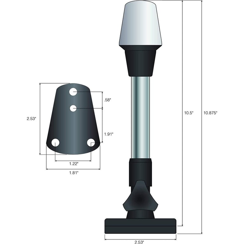 The anodized aluminum pole resists the elements, and with the twist of a thumb screw the light can be lowered out of the way. Mounts on flat surface or angled windshield. 360 degree visible globe.