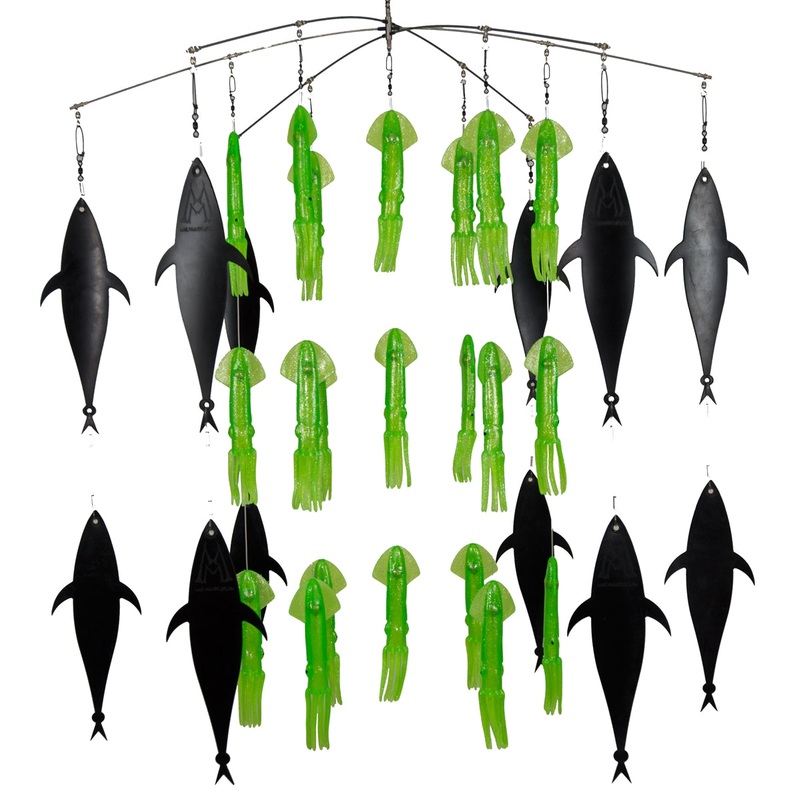 This dredge was inspired by the incredible success of both Squidnation Dredges and Blackflap Dredges in places like the Domican Republic, Costa Rica and the Bahamas. The action of the squids on the inside represent a ball of squids trying to defend themselves and the Blackflap tunas represent a pod of small tunas attacking the squid.