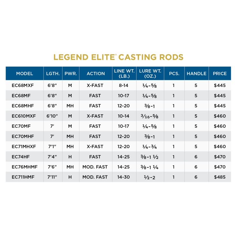 Its the pinnacle of performance. With casting models designed primarily for bass, the Legend Elite series combines classically styled rods with unmatched sensitivity and exceptional balance to deliver unsurpassed results.