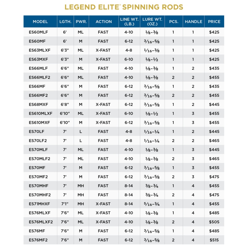 Its the pinnacle of performance. With spinning models designed for nearly every freshwater species, the Legend Elite series combines classically styled rods with unmatched sensitivity and exceptional balance to deliver unsurpassed results.