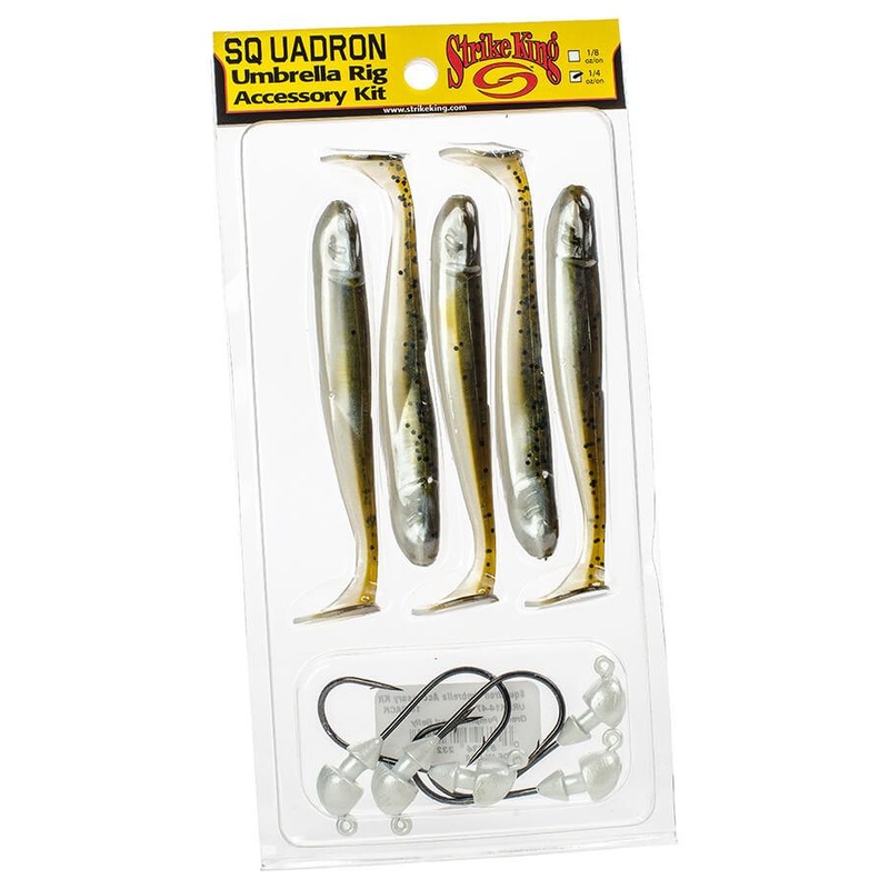 The Strike King Squadron Umbrella Rig Accessory Kit contains all the components needed for an umbrella rig. Kit includes: 5 KVD Swim-N-Shiner coffee-scent and salted swimbaits, and 5 color-coordinated Squadron Swimbait jigheads with wide-gap, chemically sharpened, black nickel hooks.