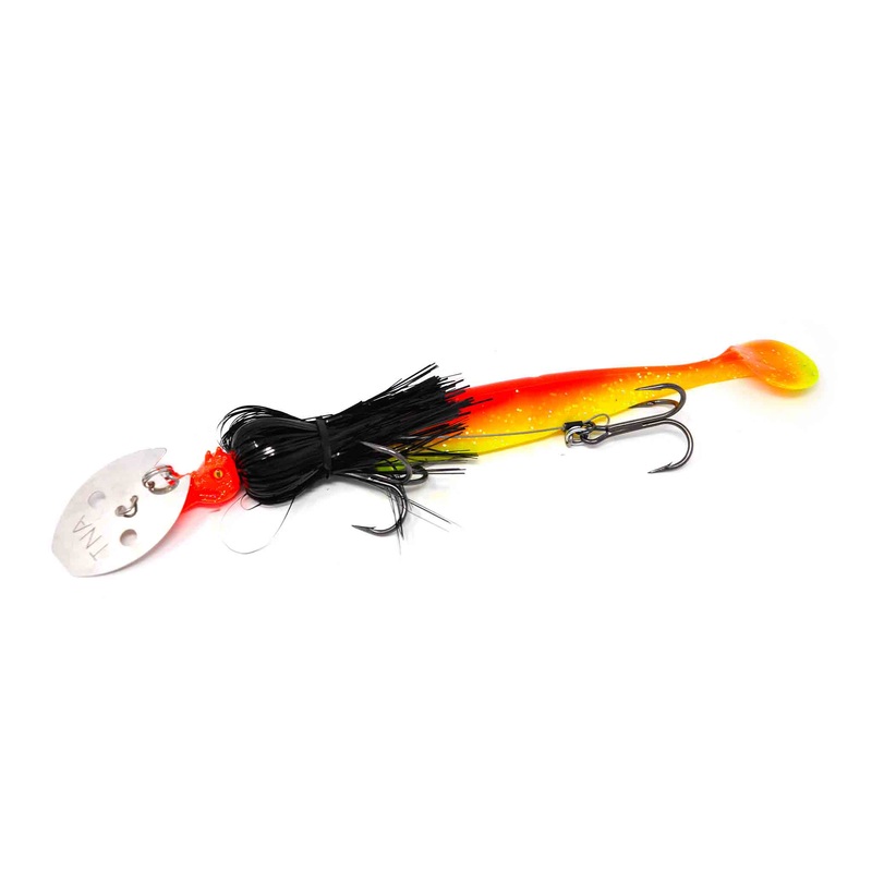Here is the new Waggin’ Dragon from TnA Tackle. A chatterbait/Paddle Tail hybrid. This bait has all the thump of the original Angry Dragon but with the added thump of a paddle tail on the back. The Paddle Tail is on a hinged system, so that tail really gets to waggin’ in the back.