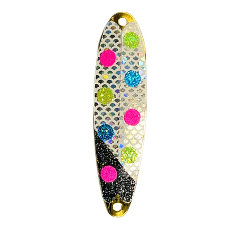 Standard with flat red/black holographic eye, standard brass finish on back, and ahigh quality Worth zinc plated split ring. Custom optionavailable to add an additional ladder in one of 13 colours to the back of the spoonat a $0.50 upcharge.High quality Eagle Claw treble hooks can be added for $1.00 or Premium quality Torpedo Tournament treble hooks can be added for $1.50. Hook upcharge includes the additional cost of packaging/shipping as hooks are protected and required to be packed and shipped in a box. Spoons without hooks will usually ship in a quality bubble mailer.