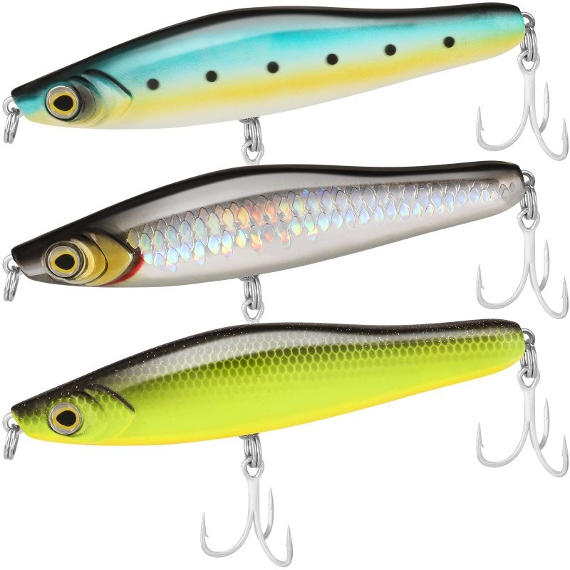 This pencil lure is different from the ordinary topwater pencil popper, it is of the sinking popper. And it sinks tremulously after casting, imitating the appearance of a small fish on the verge of death swimming in the water.The popper baits possess precise weights within the tail section, produces potent action, delivers long and bullet-like casts even when fishing in windy conditions.It makes walking the dog effortless and allows the lure to sit tail-down for a splashing, popping action that predator fish can’t resist.