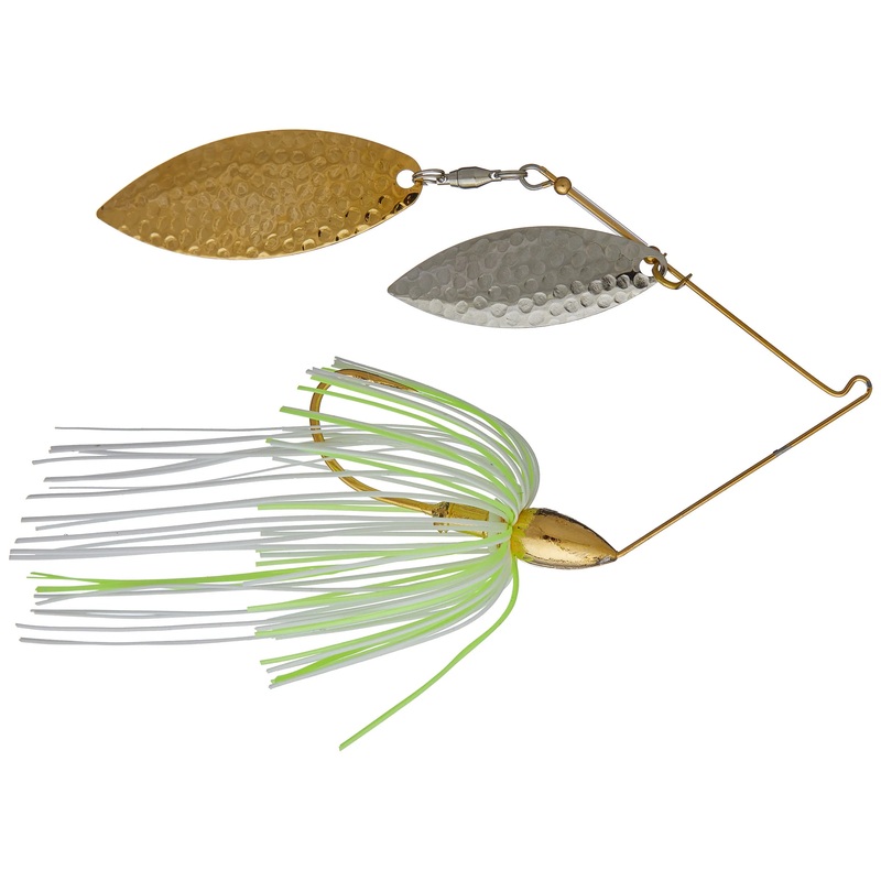 Delivering a hypnotizing amount of flash, the War Eagle Hammered Blades Double Willow Spinnerbait will add a totally new element to your spinnerbait arsenal. Featuring jewelers-grade textured blades, the War Eagle Hammered Blades Double Willow Spinnerbait transmits more light reflection that standard spinnerbait blades for those times when you need maximum flashing action. Its light wire frame and double willow blade configuration also allow anglers to use super-fast retrieves and stay perfectly balanced without rolling over.