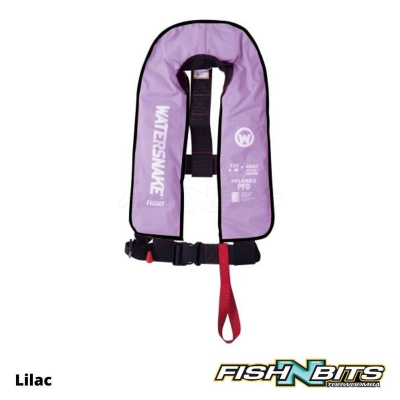 Watersnake Inflatable PFD Level 150 lifejackets are designed for general offshore and rough weather use, where a high standard of safety and performance is required, such as when fishing offshore, and they’re equally safe for fishing inshore waters, estuaries and freshwater lakes. They are designed to maintain a fully clothed person in a safe position on their back with their head clear of the water without any action required by the user. They are now also available in six colours: black, blue, red, racing-car green, lilac and camo.