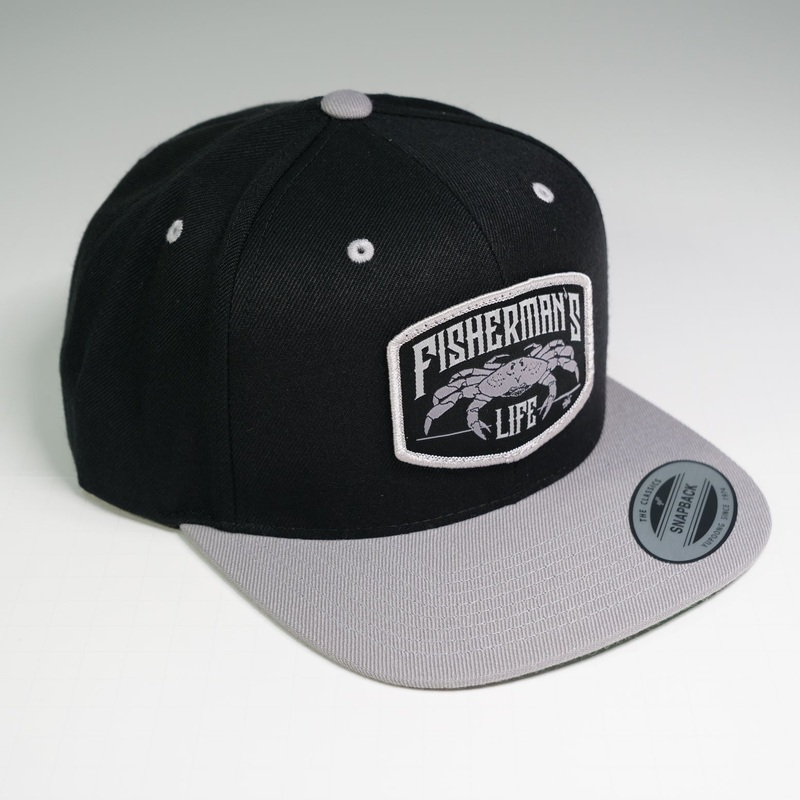 Flat brim snapback caps with the Fisherman’s Life wide crab logo. This is a sewn on embroidered patch.