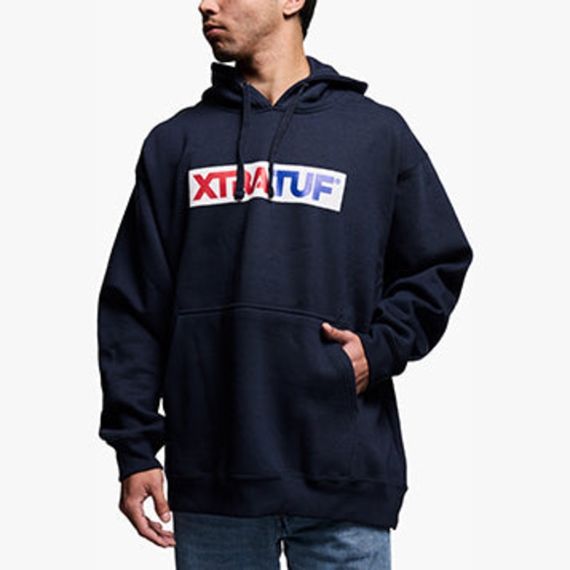 The Xtratuf Badge Logo hoodie comes in Navy and features the iconic red, white, blue Xtratuf badge logo across the chest.