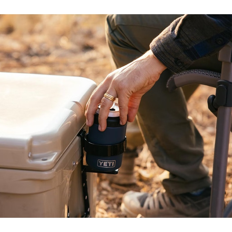 Keep your drinkware within reach when no cupholders are around. Keep your beverage within reach on the boat, at the campsite, or on the river. The YETI Beverage Holder mounts to the side of your YETI Tundra Hard Cooler or YETI Tank Ice Bucket and serves as a secure and convenient caddy for your frosty beverage. This heavy-duty, powder-coated stainless steel holder slides securely into the AnchorPoint Tie-Down slot of your YETI, but doesn’t get in the way of opening your cooler when you need to grab another.