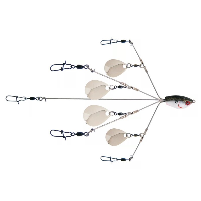 The Yumbrella Flash Mob Jr. is a compact, flashy, finesse-style umbrella rig equipped with four spinnerbait blades to help it further simulate a small school of baitfish. The little brother of the Yumbrella Flash Mob, it has all same the same great features – just with a smaller profile. Equipped with five super-strong, heat-treated stainless steel wires to ensure strength and flexibility, the Flash Mob Jr. also features high quality super strong snaps and swivels to ensure flawless performance when hooking multiple fish at the same time.